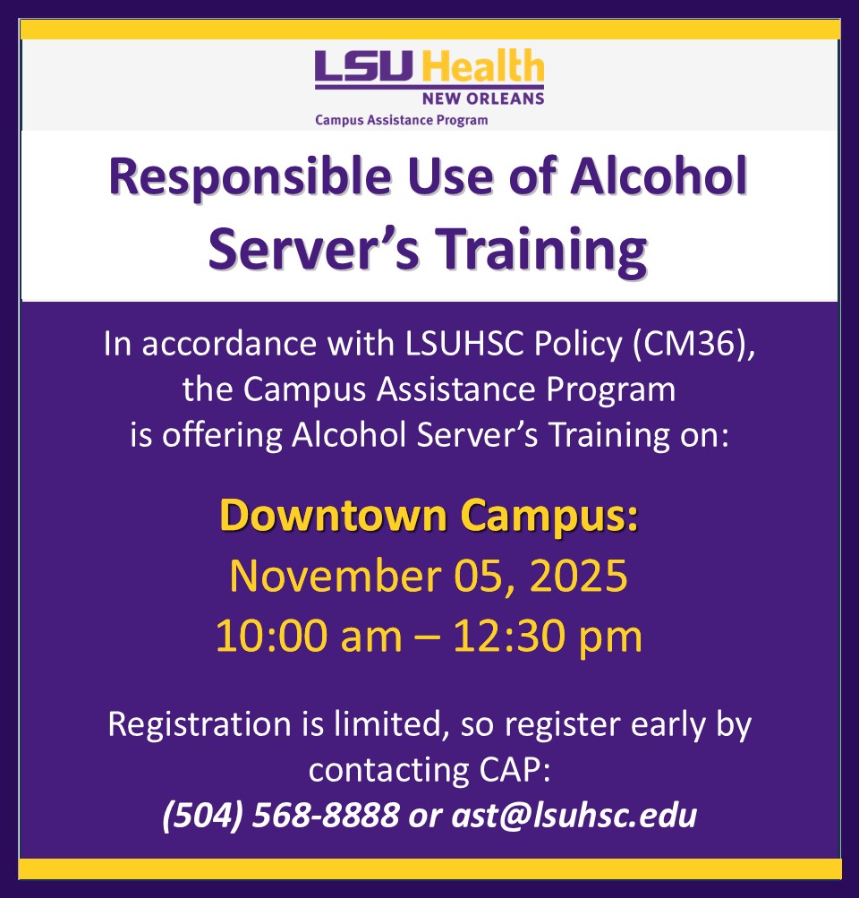 The Campus Assistance Program will be hosting an Alcohol Server’s Training in line with LSUHSC Policy CM36.