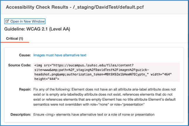 - If the accessibility check fails, you can select the issue (view issue example) to see additional details and guidance on how to resolve it. (view details example)