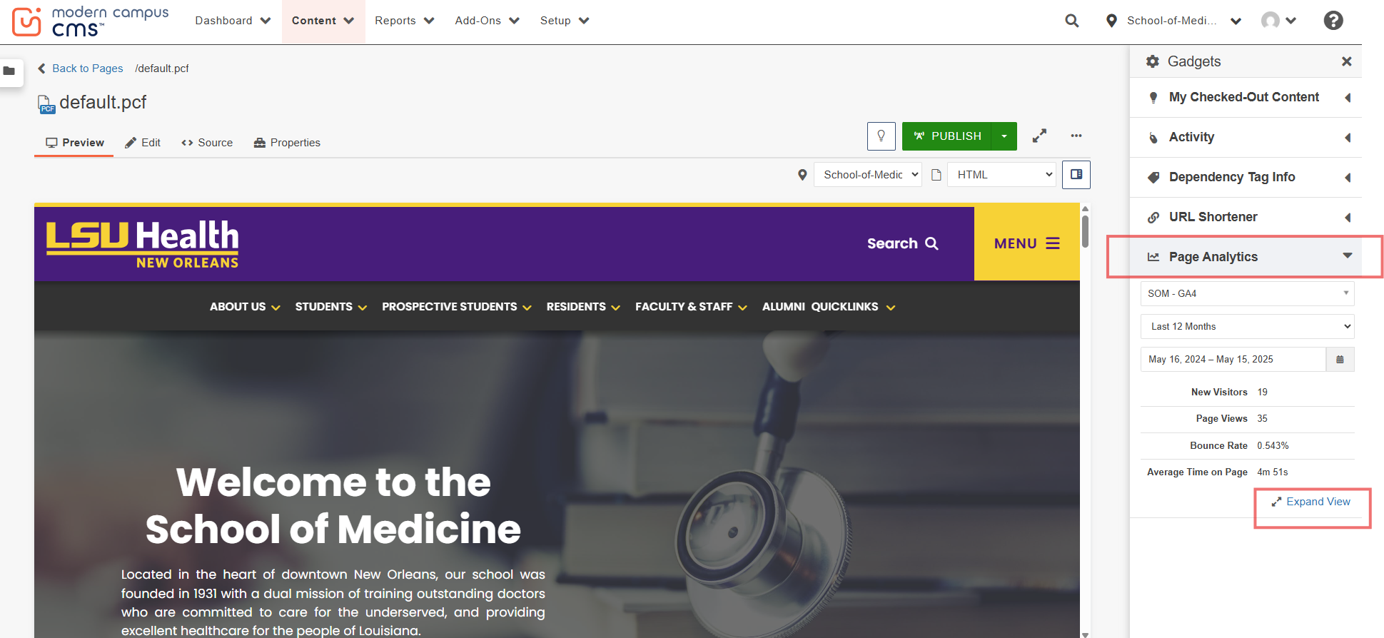 Page analytics is a dropdown menu. Click on the down arrow to see more of its functionality. Click on Expand View to access more detailed views.