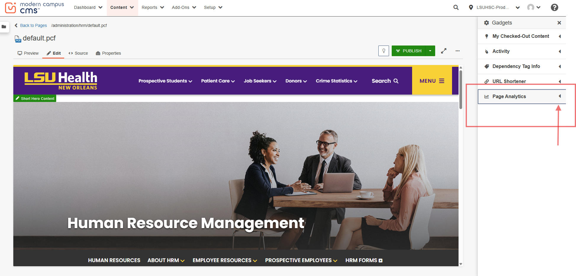 Please note that the availability or visibility of different gadgets depend on the type of content you are trying to edit. For example, Page Analytics is only available when you are on a .pcf file.