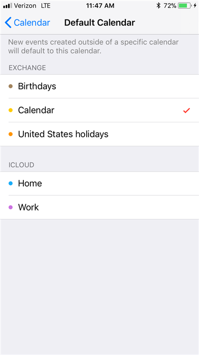 - Once the account is synced, go to Settings, Calendars and scroll up to the calendar section and choose Default Calendar. You can select your LSUHSC Exchange calendar as the default. (The default is initially set to the iCloud calendar)