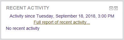 This block displays any recent activity to all users since their last login. For example, if the instructor uploads a file or a student makes a posting in a Discussion Forum, an alert will appear in the Recent Activity block. This ensures that students are alerted when instructors upload content mid-course or messages have been added to Discussion Forums.