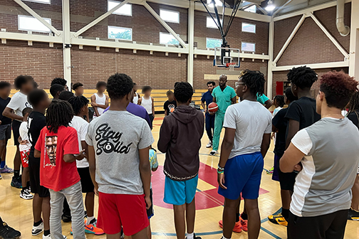 A group of LSU Health New Orleans residents and medical students was invited to play in a basketball tournament against New Orleans Recreation Department (NORD) coaches at the Rosenwald Recreation Center during the recent Night Out Against Crime. NORD organized the event to recognize the impact that the Health and Hoops with Doctors outreach program has had on the Calliope/Rosenwald community. More