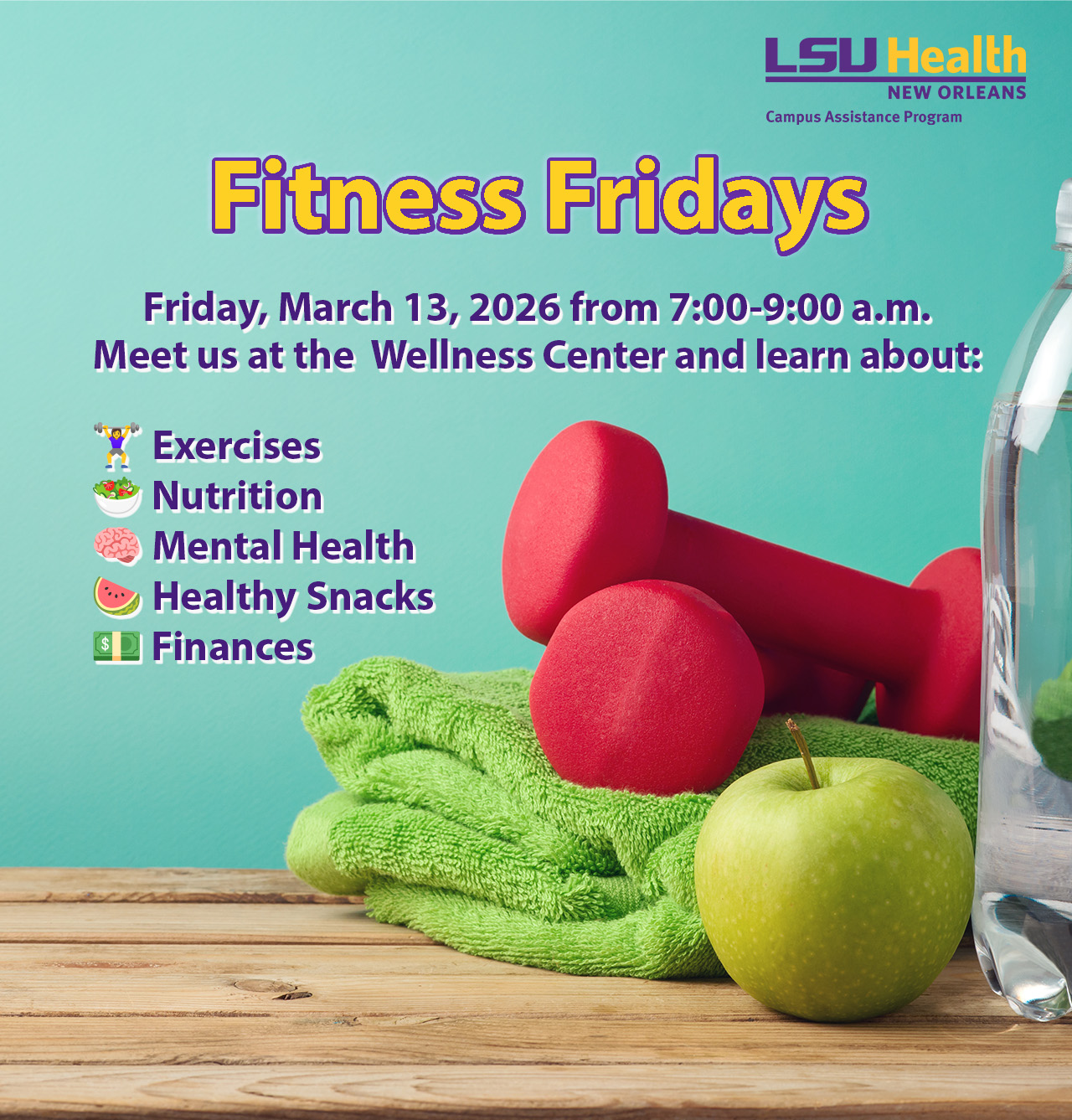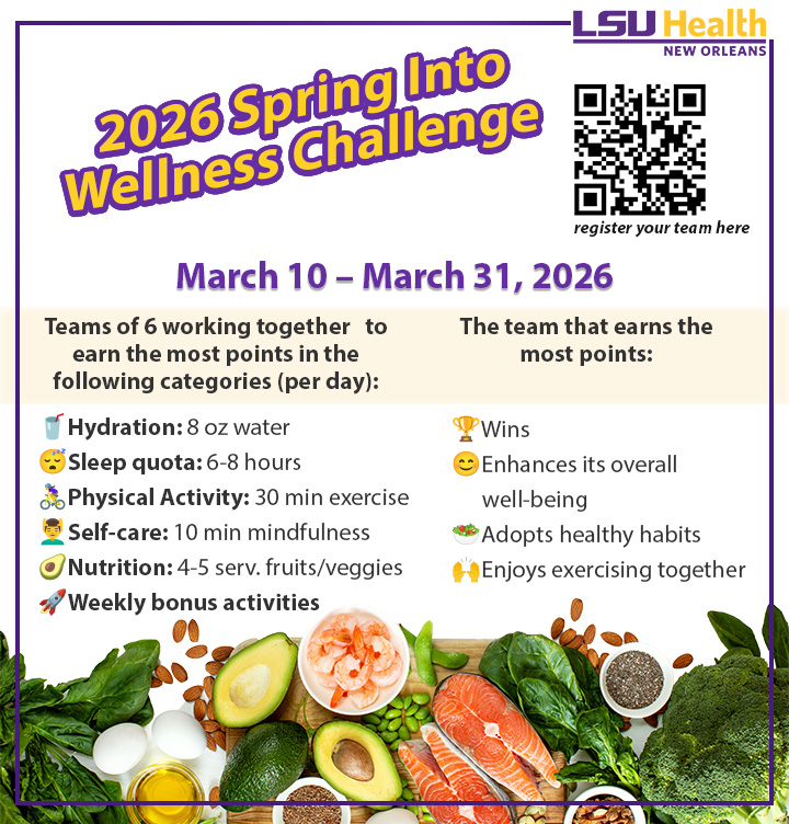 Start your morning with Fitness Fridays hosted by the LSU Health New Orleans Campus Assistance Program. Stop by the Wellness Center to explore ways to strengthen healthy habits and learn more about the resources available for practicing and improving your wellbeing.